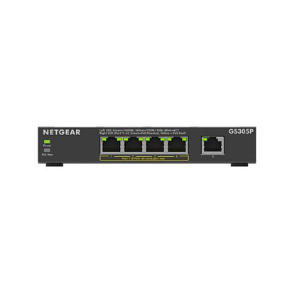 "NETGEAR GS305Pv3. Switch type: Unmanaged. Basic switching RJ-45 Ethernet ports type: Gigabit Ethernet (10/100/1000), Basic switching RJ-45 Ethernet ports quantity: 5. Full duplex. MAC address table: 2000 entries, Switching capacity: 10 Gbit/s. Networking standards: IEEE 802.1p, IEEE 802.3, IEEE 802.3ab, IEEE 802.3i, IEEE 802.3u, IEEE 802.3x. DC input voltage: 54 V. Power connector: DC-in jack. Power over Ethernet (PoE). Wall mountable"\n"5-Port Switch Gigabit Unmanaged PoE switch with 4 PoE+ ports and 63W power budget to power Wireless AP, IP Cameras, IP Phones and more.
