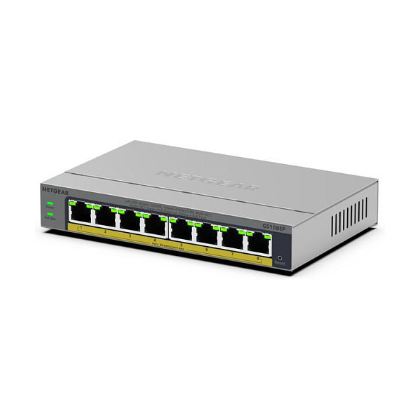 "NETGEAR GS108EP. Switch type: Managed, Switch layer: L2/L3. Basic switching RJ-45 Ethernet ports type: Gigabit Ethernet (10/100/1000), Basic switching RJ-45 Ethernet ports quantity: 8. MAC address table: 4000 entries. Networking standards: IEEE 802.1Q, IEEE 802.1p, IEEE 802.3az"\n"More Capabilities beyond Plug-and-play Connectivity