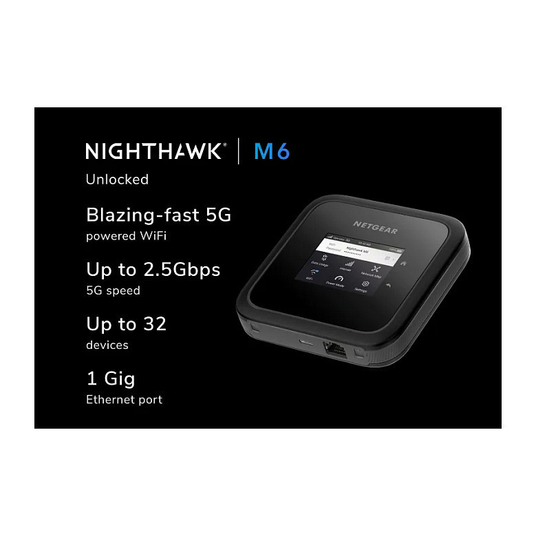 "NETGEAR Nighthawk M6. Device type: Cellular network router, Product colour: Black, Market positioning: Portable. Ethernet LAN interface type: Gigabit Ethernet, Ethernet LAN data rates: 10,100,1000 Mbit/s, Supported network protocols: IPv6. Wi-Fi standards: 802.11a, 802.11b, 802.11g, Wi-Fi 4 (802.11n), Wi-Fi 5 (802.11ac), Wi-Fi 6 (802.11ax), Wi-Fi frequency: 5 GHz. Data network: 4G, 5G, LTE, 4G standard: LTE. USB port type: USB Type-C"\n"Unlocked for ultimate flexibility