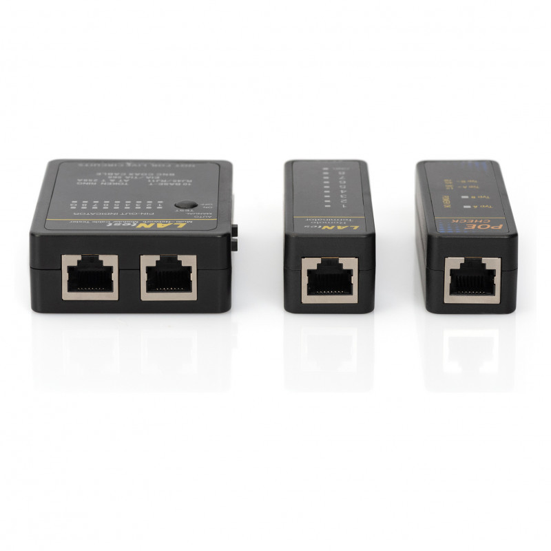 "Digitus Network and Communication Cable Tester, RJ45 and BNC. Supported connectors: RJ-45, Test type: PoE testing, Product colour: Black. Battery voltage: 9 V. Certification: CE. Width: 55 mm, Depth: 25 mm, Height: 80 mm. Cables included: BNC, LAN (RJ-45)"\n"Future-oriented standards and high-end quality for your network.