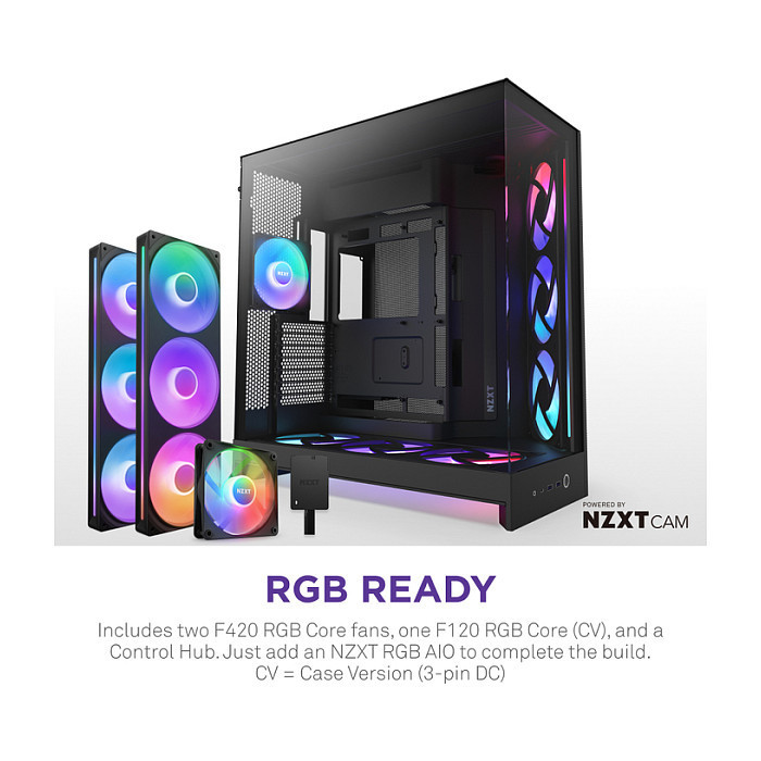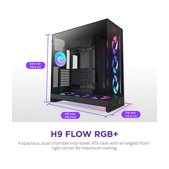 "NZXT H9 Flow RGB+. Form factor: Midi Tower, Type: PC, Product colour: Black. Front fans diameters supported: 120,140 mm, Rear fans installed: 1x 120 mm, Rear fans diameters supported: 120 mm. Supported HDD sizes: 2.5,3.5"". Width: 315 mm, Depth: 481 mm, Height: 506 mm"\n"Large Dual-Chamber Mid-Tower ATX Airflow Case with RGB and Control Hub