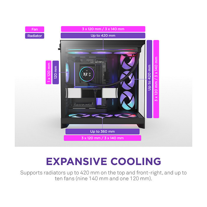 Holds up to 420 mm radiators on the top and front-right panels for versatile cooling.