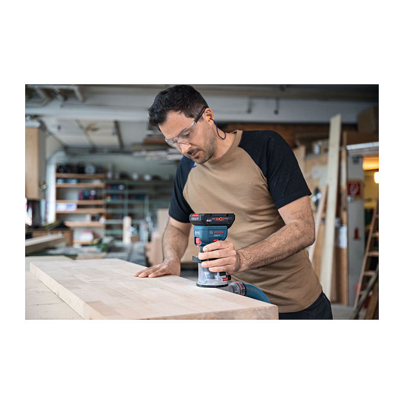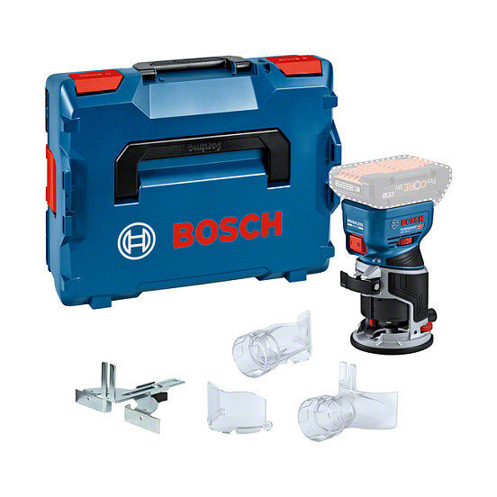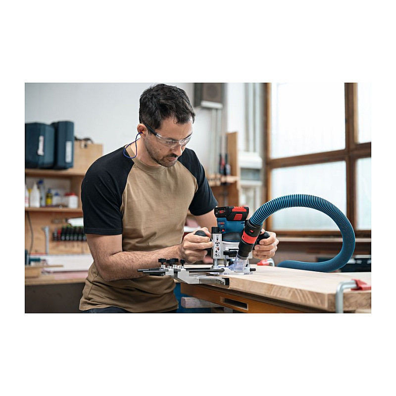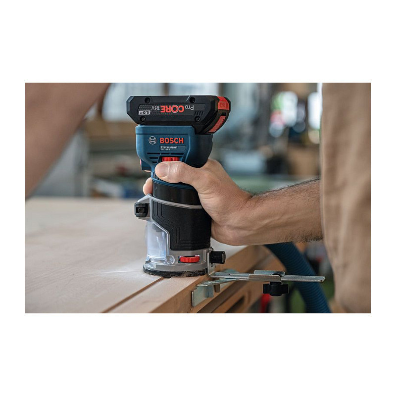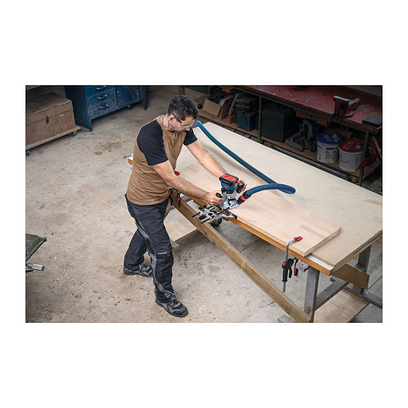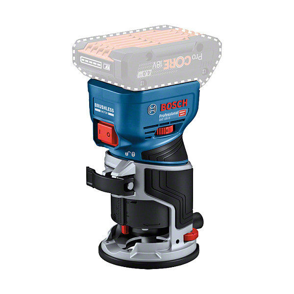 In addition, the GKF 18V-8 is the world's only 18V palm router with purpose-built surface and edge routing vacuum adaptors, providing highly efficient dust collection in all situations."