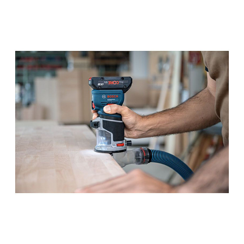 In addition, the GKF 18V-8 is the world's only 18V palm router with purpose-built surface and edge routing vacuum adaptors, providing highly efficient dust collection in all situations."