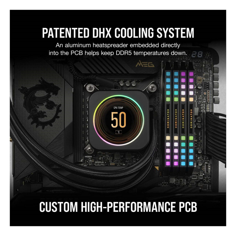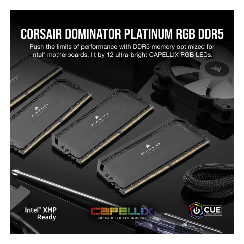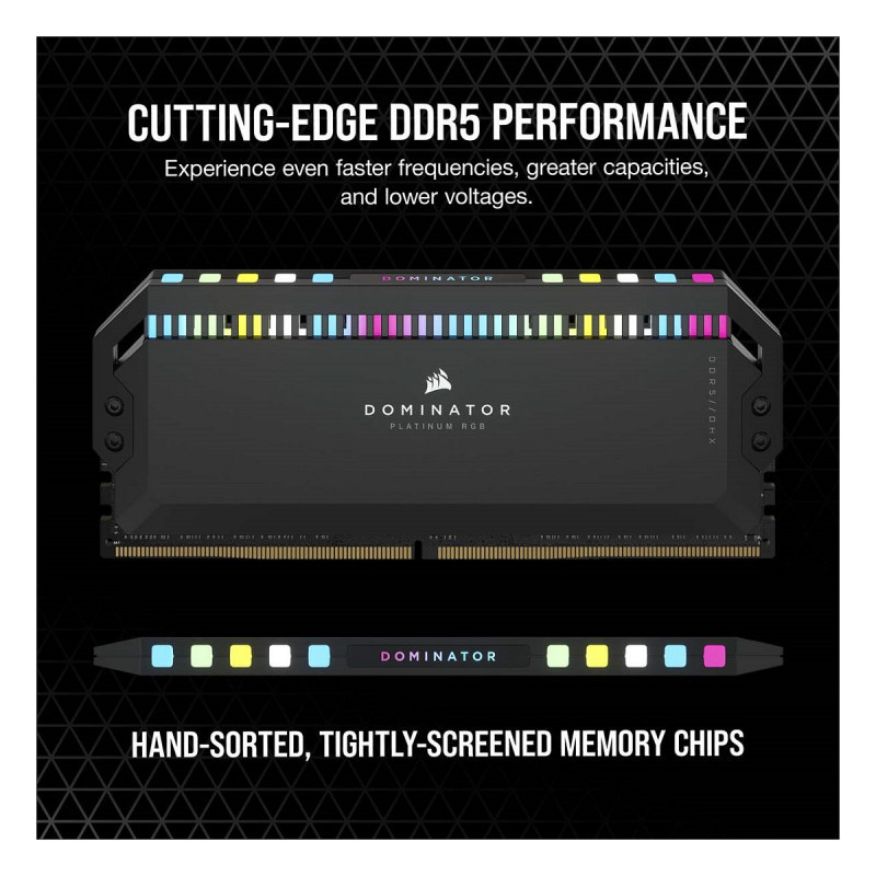 "Corsair Dominator CMT32GX5M2B6400C32. Component for: PC, Internal memory: 32 GB, Memory layout (modules x size): 2 x 16 GB, Internal memory type: DDR5, Memory clock speed: 6400 MHz, Memory form factor: 288-pin DIMM, CAS latency: 32"\n"DOMINATOR PLATINUM RGB