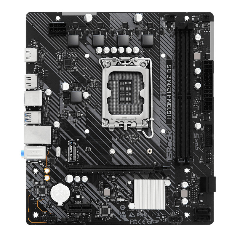"Asrock H610M-H2/M.2 D5. Processor manufacturer: Intel, Processor socket: LGA 1700. Supported memory types: DDR5-SDRAM, Maximum internal memory: 96 GB, Memory slots type: DIMM. Supported storage drive interfaces: M.2, SATA III. Ethernet interface type: Gigabit Ethernet, LAN controller: Realtek 8111H. Component for: PC, Motherboard form factor: micro ATX, Motherboard chipset family: Intel"\n"Digi Power