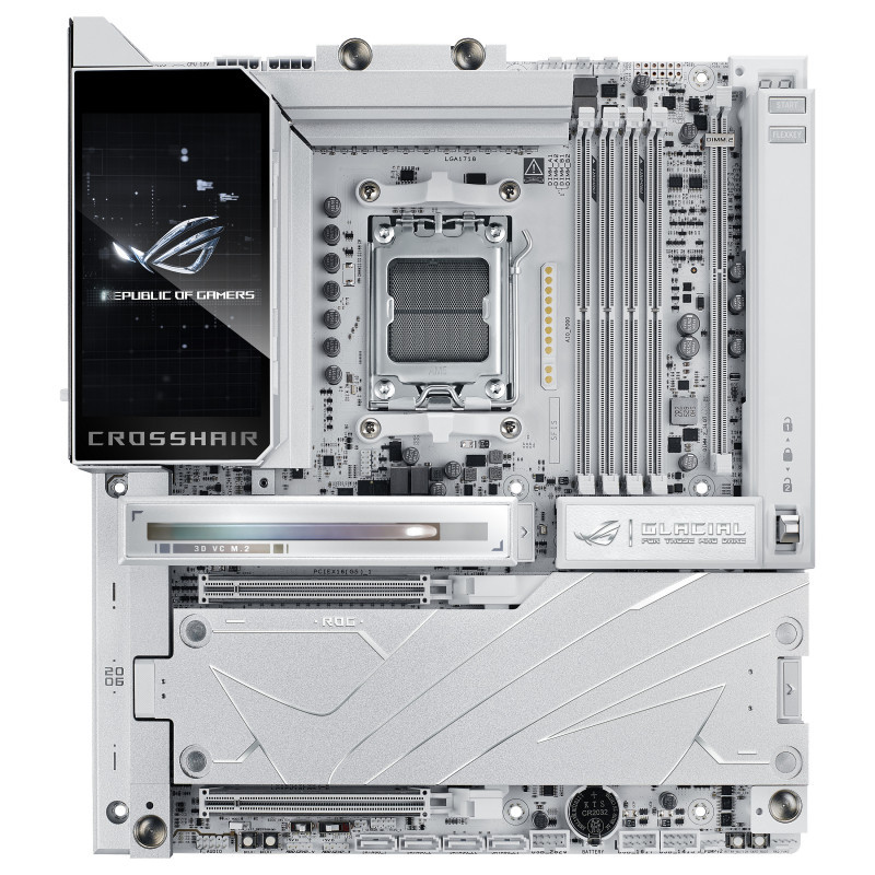 "ASUS ROG CROSSHAIR X870E GLACIAL. Processor manufacturer: AMD, Processor socket: Socket AM5, Compatible processor series: AMD Ryzen 7000 Series, AMD Ryzen 8000 Series, AMD Ryzen 9000 Series. Supported memory types: DDR5-SDRAM, Maximum internal memory: 256 GB, Memory slots type: DIMM. Supported storage drive interfaces: M.2, SATA III, Supported storage drive types: HDD & SSD, RAID levels: 0, 1, 5, 10. Ethernet interface type: 10 Gigabit Ethernet, Top Wi-Fi standard: Wi-Fi 7 (802.11be), Wi-Fi standards: Wi-Fi 7 (802.11be). Component for: PC, Motherboard form factor: Extended ATX, Motherboard chipset family: AMD"\n"The ROG X870E Glacial is a flagship motherboard engineered for uncompromising performance and sophisticated AI. It boasts a robust 24+2+2 power stage design, Dynamic OC Switcher, and Core Flex for next-generation overclocking control. Meanwhile, advanced memory tuning is unlocked through server-grade DRAM enhancement and NitroPath DRAM technology, and storage scales with support for up to seven M.2 drives. Top-tier connectivity includes two 10G Ethernet ports, two USB4® ports, and two USB 20Gbps Type-C® front-panel connectors. This motherboard also features a 3D VC M.2 heatsink and a 5-inch LCD display, along with AI Cache Boost and AI Advisor for smarter, more intuitive system tuning.