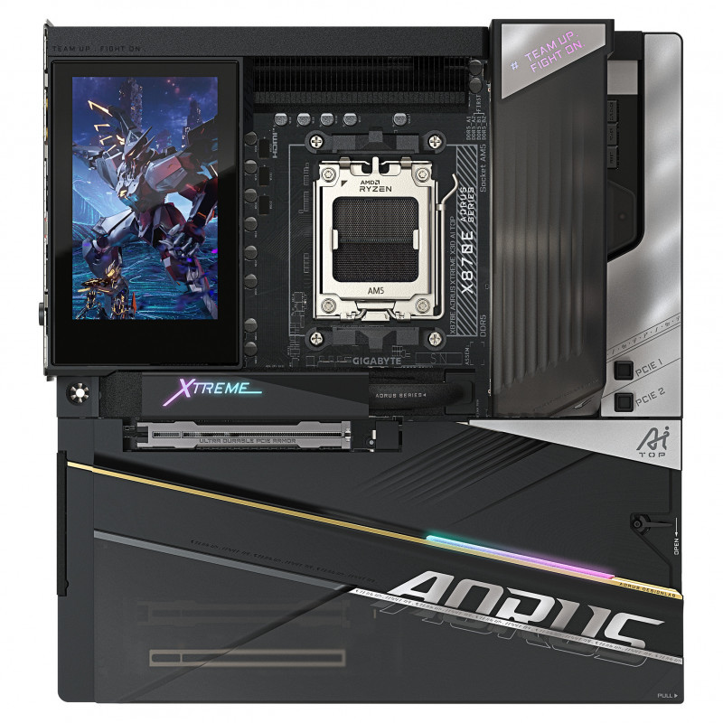"GIGABYTE X870E AORUS XTREME X3D AI TOP Motherboard - Supports AMD Ryzen 9000 Series CPUs, 24+2+2 phases VRM, up to 9000MHz DDR5 (OC), 2xPCIe 5.0 M.2 + 3xPCIe 4.0 M.2, WI-FI 7, 10GbE LAN, USB 4. Processor manufacturer: AMD, Processor socket: Socket AM5, Compatible processor series: AMD Ryzen 7000 Series, AMD Ryzen 8000 Series, AMD Ryzen 9000 Series. Supported memory types: DDR5-SDRAM, Maximum internal memory: 256 GB, Memory slots type: DIMM. Supported storage drive interfaces: M.2, SATA III, Supported storage drive types: HDD & SSD, RAID levels: 0, 1, 5, 10. Maximum resolution: 4096 x 2160 pixels. Ethernet interface type: 10 Gigabit Ethernet, LAN controller: Realtek RTL8127, Top Wi-Fi standard: Wi-Fi 7 (802.11be)"\n"Elevate your computing experience with GIGABYTE's renowned motherboard series: AORUS, AERO, and GIGABYTE. Featuring innovative designs and advanced features, these boards offer exceptional performance and reliability. Whether you're a gamer, content creator, or professional, our series cater to your needs, ensuring uncompromising quality and cutting-edge technology."