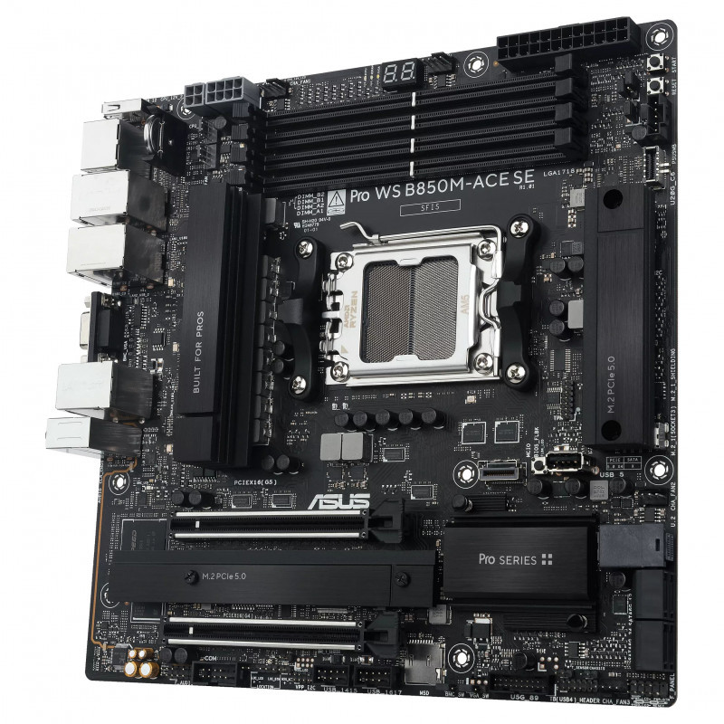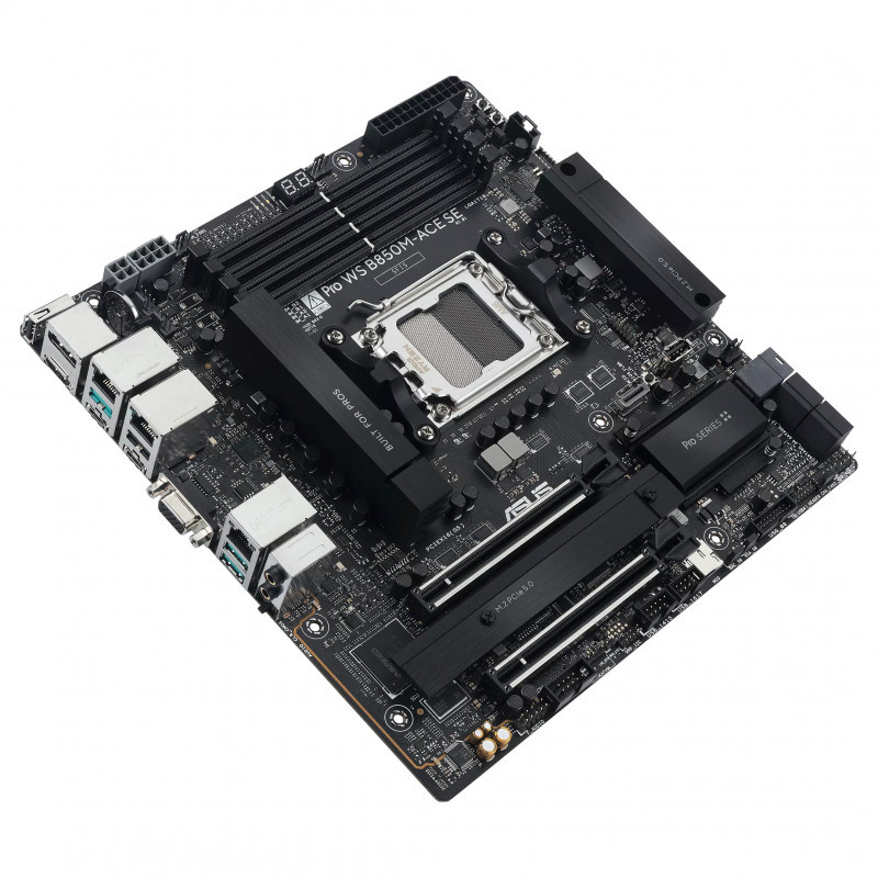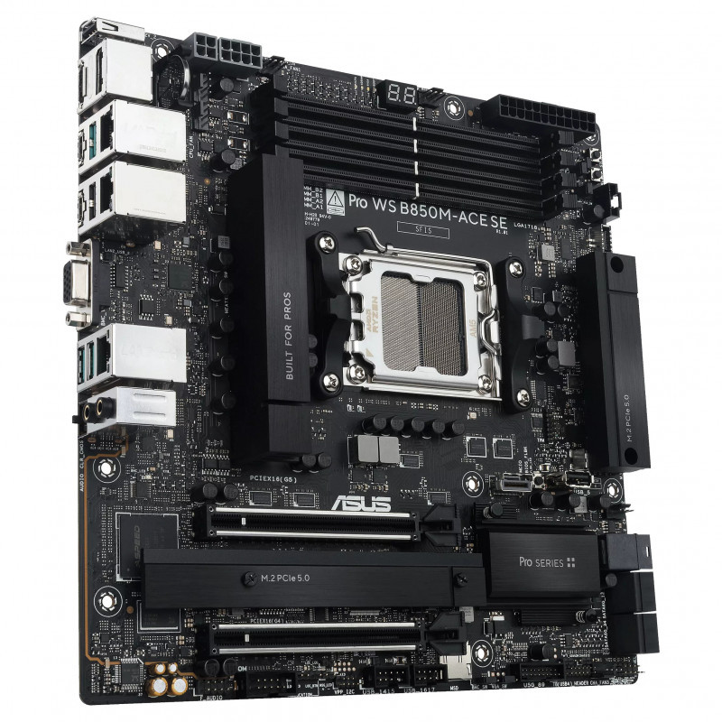 "ASUS PRO WS B850M-ACE SE. Processor manufacturer: AMD, Processor socket: Socket AM5, Compatible processor series: AMD Ryzen 7000 Series, AMD Ryzen 8000 Series, AMD Ryzen 9000 Series. Supported memory types: DDR5-SDRAM, Maximum internal memory: 256 GB, Memory slots type: DIMM. Supported storage drive interfaces: M.2, SATA III, Supported storage drive types: HDD & SSD, RAID levels: 0, 1, 5, 10. Maximum resolution: 7680 x 4320 pixels. Ethernet interface type: 2.5 Gigabit Ethernet, Gigabit Ethernet, 10 Gigabit Ethernet"\n"The Pro WS B850M-ACE SE empowers workstation users of all levels by maximizing the performance of the latest AMD Ryzen™ processors via 8+2+1 team power stages, DDR5 slots, PCIe® 5.0 and lightning-fast connectivity including a front USB 20Gbps Type-C® connector, plus 10Gb and 2.5Gb Ethernet.