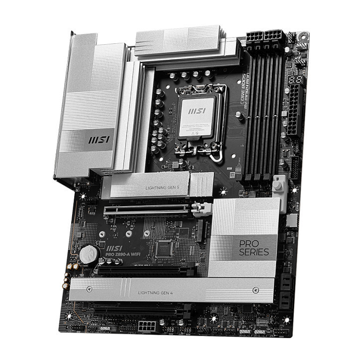 PRO Z890-A WIFI offers a simple design with a harmonious silver color scheme that perfectly matches both white and black PC builds. It is engineered with many exclusive features of MSI including true Wi-Fi 7 with EZ Antenna, 5G LAN, Thunderbolt 4, PCIe 5.0 M.2 with EZ M.2 Shield Frozr II, and Supplemental PCIe Power, ready for the Intel® Core™ Ultra processors.