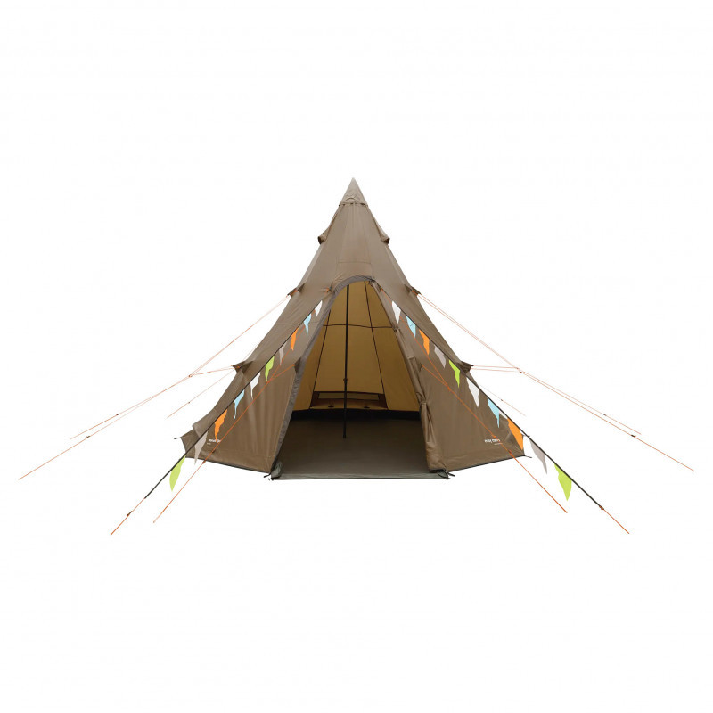 "Easy Camp Rands Tipi. Number of sleeping places: 8 person(s), Tent fly sheet waterproof rating: 3 m, Setup time: 11 min. Type: Pyramid tent, Purpose: Camping, Product colour: Sand. Ground cloth material: Polyethylene, Interior material: Polyester, Exterior finish material: Polyester. Width: 3850 mm, Depth: 3750 mm, Height: 2850 mm. Package width: 730 mm, Package height: 210 mm"\n"The Rands Tipi is designed for simplicity and comfort. Its single central pole makes pitching quick and effortless, while the mesh door zips securely to the groundsheet for a snug fit. A covered roof vent and three low vents provide excellent airflow, ensuring a comfortable experience. The flexible groundsheet can be folded down or toggled up at the entrance to suit your needs. With six handy organiser pockets, a central hanging point, and decorative bunting, this stylish tent offers everything you need for a hassle-free adventure — perfect for glamping!"