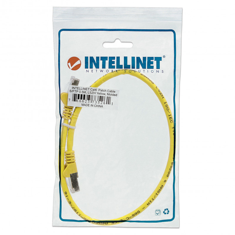 "Intellinet Network Patch Cable, Cat6A, 5m, Yellow, Copper, S/FTP, LSOH / LSZH, PVC, RJ45, Gold Plated Contacts, Snagless, Booted, Lifetime Warranty. Cable length: 5 m, Cable standard: Cat6a, Cable shielding: S/FTP (S-STP), Connector 1: RJ-45, Connector 2: RJ-45, Connector contacts plating: Gold, Data transfer rate: 10000 Mbit/s, Product colour: Yellow"\n"10 Gigabit data transmission over twisted pair cable — The next generation of network technology.