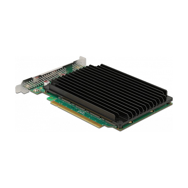 "DeLOCK PCI Express x16 Card to 4 x internal NVMe M.2 Key M with heat sink - Bifurcation. Host interface: PCIe, Output interface: M.2, Expansion card standard: PCIe 4.0. Product colour: Black, Purpose: PC, Cooling type: Passive. Windows operating systems supported: Windows 10, Windows 8.1, Server operating systems supported: Windows Server 2016. Package type: Box"\n"This PCI Express card by Delock expands the PC by four M.2 slots. Up to four M.2 SSDs in format 2280, 2260, 2242 and 2230 can be connected. With the help of the large heat sink sufficient cooling of the M.2 modules is guaranteed.