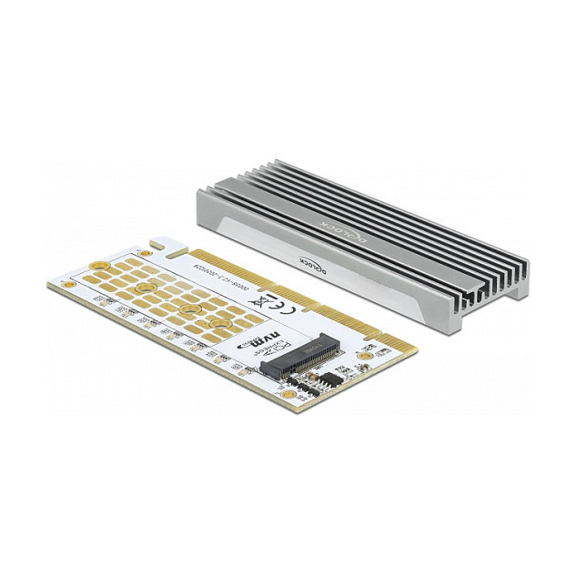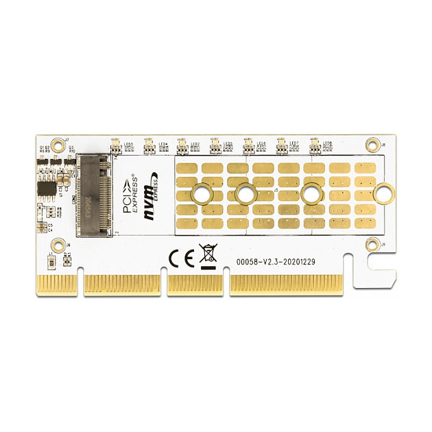 "DeLOCK PCI Express x16 (x4 / x8) Card to 1 x NVMe M.2 Key M with LED illumination. Host interface: PCIe, Output interface: M.2. Product colour: Grey, Cooling type: Passive, Country of origin: China. Width: 44 mm, Depth: 98 mm, Height: 5 mm"\n"This PCI Express card by Delock expands the PC by one M.2 slot. One M.2 module in 2280, 2260, 2242 or 2230 format can be connected. The card can be operated through the notches on an x1, x4, x8 or x16 slot. If the card will be installed in the PC, the slot bracket does not have to be removed.
