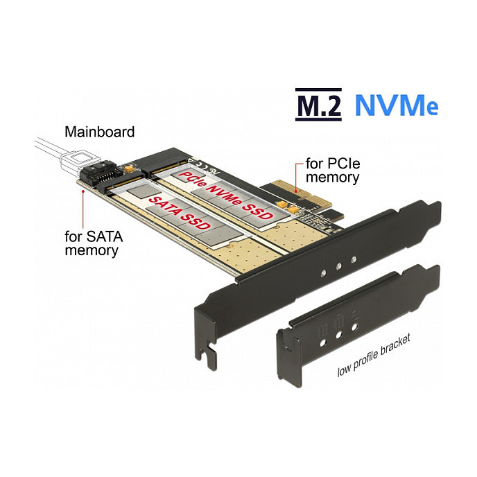 "DeLOCK 89630. Host interface: PCIe, Output interface: M.2, SATA. Cooling type: Passive, Country of origin: China. Windows operating systems supported: Windows 10, Windows 7, Windows 8, Windows 8.1. Package type: Hanging box"\n"This PCI Express card by Delock expands the PC by two M.2 slots. One M.2 SATA module can be connected in format 22110, 2280, 2260, 2242, 2230 with this card and connected via SATA cable to the motherboard. Additionally, one M.2 PCIe module in format 22110, 2280, 2260, 2242, 2230 can be connected. Both slots can be used at the same time."