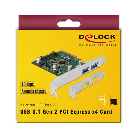 "DeLOCK 90298. Host interface: PCIe, Output interface: USB 3.2 Gen 1 (3.1 Gen 1), Expansion card standard: PCIe 3.0. Country of origin: China. Chipset: Asmedia ASM3142, Data transfer rate (max): 10 Gbit/s. Windows operating systems supported: Windows 10, Windows 7, Windows 8.1. Package type: Hanging box"\n"This PCI Express card by Delock expands the PC by two external USB 3.1 ports. Different USB Type-A devices, such as docking stations, card readers, external enclosure etc., can be connected to the card. The card allows a data transfer rate of 10 Gbps on both ports when used simultaneously."