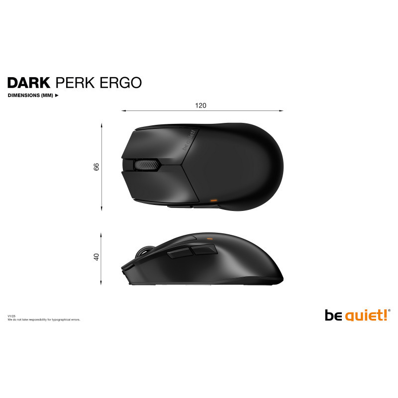 "be quiet! Dark Perk | Ergo. Form factor: Right-hand. Movement detection technology: Optical, Device interface: RF Wireless + USB Type-C, Movement resolution: 32000 DPI, Response time: 0.125 ms, Buttons type: Pressed buttons, Buttons quantity: 5, Scroll type: Wheel, Acceleration (max): 50 G. Power source: Batteries/Cable. Product colour: Black"\n"Aim with surgical precision