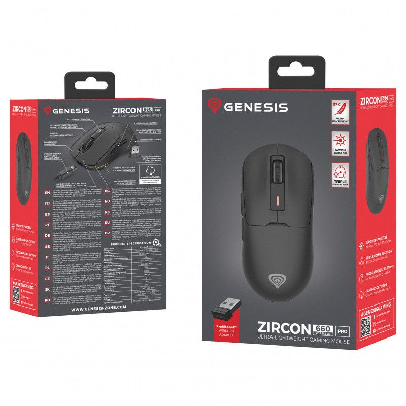 "GENESIS NMG-2193. Form factor: Ambidextrous. Movement detection technology: Optical, Device interface: Bluetooth + USB Type-C, Movement resolution: 26000 DPI, Buttons quantity: 6, Scroll type: Ring, Acceleration (max): 50 G. Power source: Batteries/Cable. Product colour: Black"\n"Triple communication mode, one of the best optical sensors and an even lighter weight of just 57 grams, and that's not all. Here is the GENESIS Zircon 660 Pro, which offers even more. Whether you're a novice gamer or an advanced e-sports gaming fan, the GENESIS Zircon 660 Pro offers reliability, comfort and top-of-the-line features to give you a real edge.