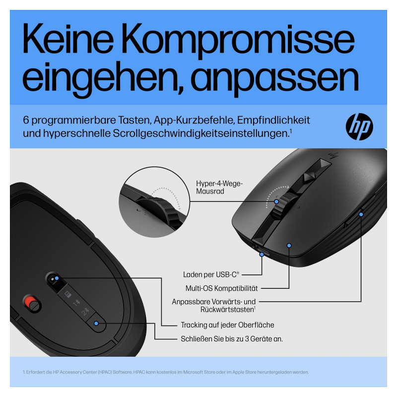 "HP 710 Rechargeable Silent Mouse. Form factor: Ambidextrous. Device interface: RF Wireless + Bluetooth, Movement resolution: 3000 DPI, Buttons quantity: 7, Scroll type: Wheel. Power source: Batteries. Product colour: Black"\n"Can a Mouse Set You Free?