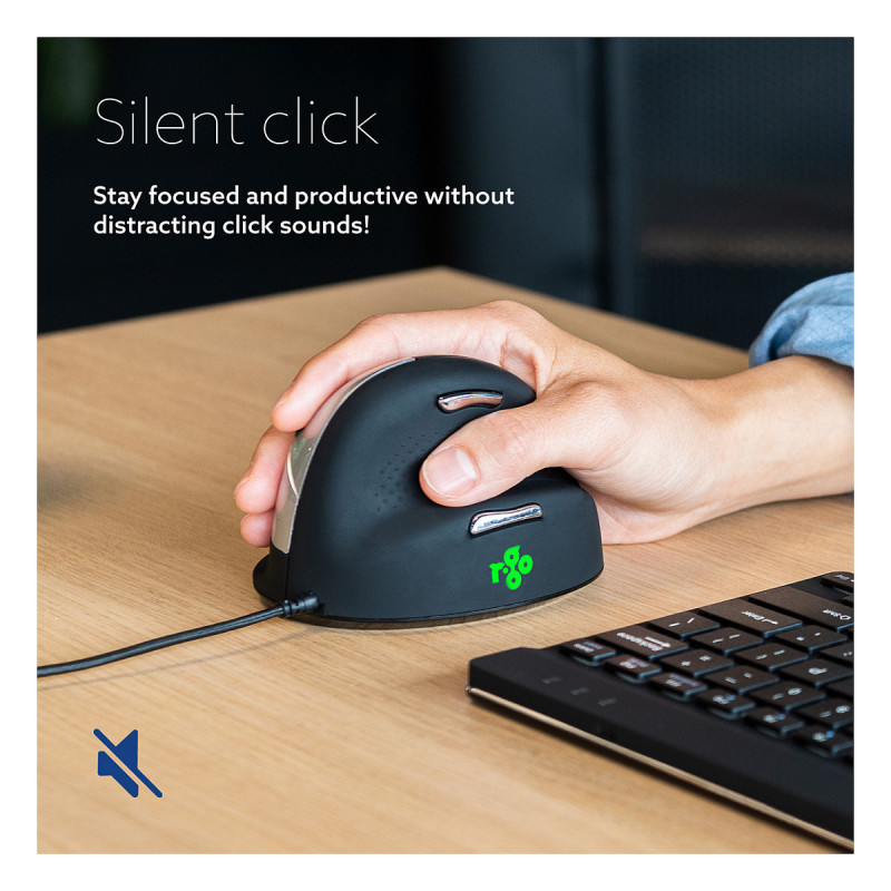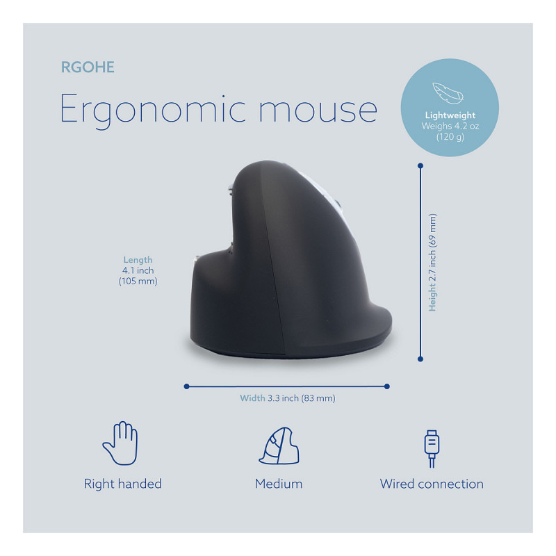"R-Go Tools Ergonomic mouse R-Go HE Break with break software, medium (hand size 165-185 mm), right-handed, Wired, black. Form factor: Right-hand. Movement detection technology: Optical, Device interface: USB Type-A, Movement resolution: 2400 DPI, Buttons type: Pressed buttons, Buttons quantity: 5, Scroll type: Wheel. Power source: Cable. Product colour: Black"\n"The R-Go HE Break Mouse is an ergonomic vertical mouse with integrated break software. This smart mouse helps you remember when it’s time for a break. The ergonomic R-Go HE Break mouse has a vertical position, so you will automatically move the mouse with your forearm instead of just your hand. This prevents strain injuries, such as CANS. The HE Break mouse has a round shape, so your hand and wrist are in a natural, relaxed position. The mouse fits comfortably in your hand and supports all fingers. Are you left- or right-handed? We have different versions and sizes available, so the mouse fits every hand. The LED colour signals in the mouse indicate how healthy you are working and when it is time for a break. The mouse encourages you to take breaks on a frequent basis. These vital breaks help prevent physical complaints, stimulate blood circulation in the body and keep you fit during your working day. During mouse usage, the light changes colour, like a traffic light. Green means ‘good job’, orange that it is time for a break, red that you have been working too long. By using these subtle colour signals, you receive feedback on healthy (break) behaviour in a simple and positive way. This product works together with the R-Go Break Software that won the Benelux Office Products Award 2021."
