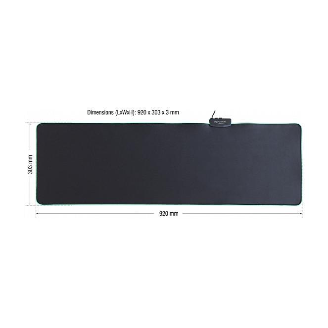 "DeLOCK 12555. Width: 920 mm, Depth: 303 mm. Product colour: Black, Surface coloration: Monochromatic, Backlight colour: Red/Green/Blue"\n"This high quality soft mouse pad by Delock can be connected to a PC or laptop with a USB Type-A interface. It convinces with its illuminating RGB border. By using the button on the side, there are different colour modes in 7 different shades, which can be activated, e.g. a single colour or a smooth colour gradient. Due to its special size, this mouse pad offers enough space to work with computer mouse."