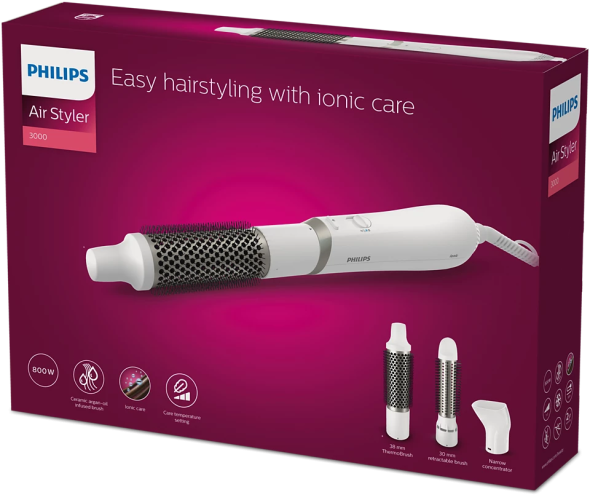 Džiovinkite ir formuokite vienu metu. Su „Philips Air Styler 3000“ galėsite sukurti gražų, natūralų stilių ir tuo pat metu suteikti daugiau žvilgesio naudodami jonizuojančios priežiūros funkciją. 3 priedai yra tinkami tiek ilgiems, tiek trumpiems plaukams, todėl mėgausitės lengvai formuodami plaukus.
