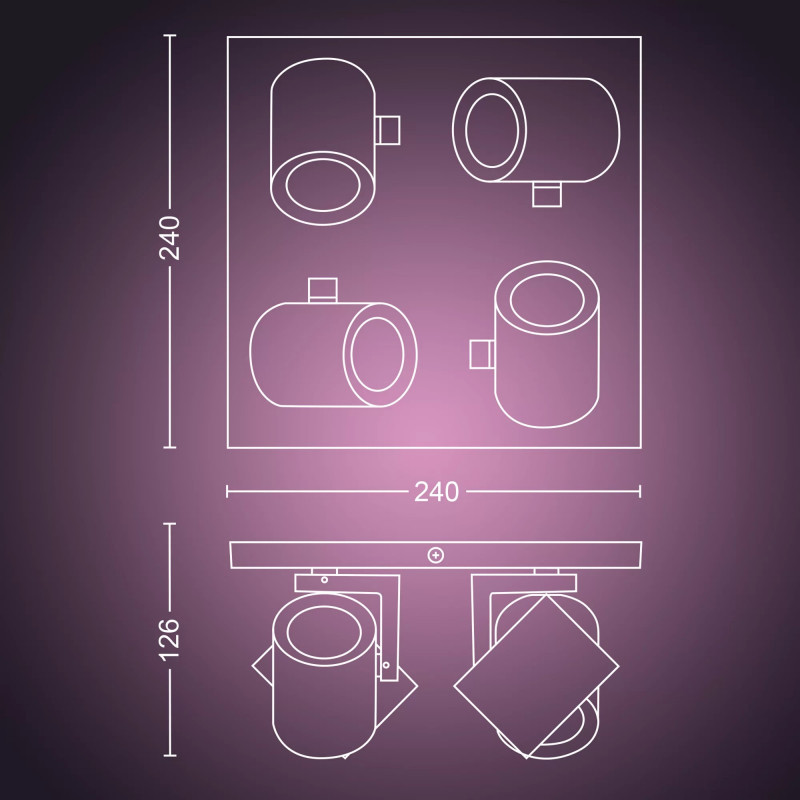 "Philips Hue White and colour ambience Argenta quadruple spotlight. Type: Smart lighting spot, Interface: Bluetooth, Product colour: White. Energy efficiency class: E, Input voltage: 230 V, AC input frequency: 50-60 Hz. Width: 240 mm, Depth: 240 mm, Height: 127 mm. Package type: Box, Package width: 294.5 mm, Package depth: 293 mm. Quantity per pack: 1 pc(s)"\n"Easy smart lighting