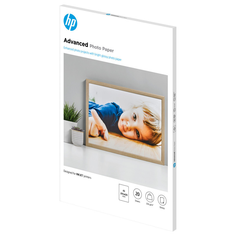 "HP Advanced Photo Paper Glossy 250 g/m2 A3 (297 x 420 mm) 20 sheets. Finish type: High-gloss, Media weight: 250 g/m², Paper size: A3. Width: 322.3 mm, Depth: 19.1 mm, Height: 460.4 mm. Package dimensions (WxDxH): 460.4 x 322.3 x 19.05 mm, Quantity per pack: 1 pc(s), Package width: 455 mm. Pallet gross weight: 270 kg, Master (outer) cases per pallet: 25 pc(s), Layers per pallet: 5 pc(s). Dimensions (WxDxH): 322.3 x 19.05 x 460.4 mm, Media size (1 slide): 297 x 420 mm, Media sheets per package: 20 sheets"\n"Ideal for inkjet printer users and HP Inkjet printer owners printing high-quality, true-to-life photos for scrapbooking, photo albums, and framing.