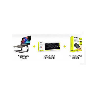 The 3-in-1 home office essential set features an ergonomic 10 ""to 15.6"" laptop stand, a USB office keyboard and a USB optical mouse.