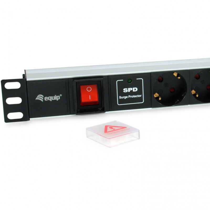 "Equip 7-Outlet German Power Distribution Unit with Surge Protection and Switch. Rack capacity: 1U, Housing material: Aluminium, Product colour: Black, Silver. AC outlets quantity: 7 AC outlet(s), AC outlet types: Type F, Power plug: Type F. Cable length: 1.8 m. Nominal input voltage: 250 V, Maximum current: 16 A, AC input frequency: 50 - 60 Hz. Compliance certificates: CE, RoHS"\n"The equip power distribution unit is a high-quality and robust product that was developed for the supply of power in data cabinets and ensures safety with its integrated surge protection. The power strip is carefully tested to ensure functionality and reliability. A 1.8m long supply cable and a built-in on/off switch complete the functionality of this power distribution unit. The optimized design also makes it easy to install. The ideal choice for 19"" cabinet system installation."