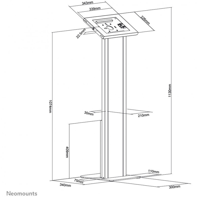 "Neomounts FL15-750WH1 Tablet floor stand 9.7-11"" - lockable. Maximum screen size: 27.9 cm (11""), Minimum screen size: 24.6 cm (9.7""), Product colour: White. Width: 343 mm, Depth: 340 mm, Height: 1130 mm. Package width: 1075 mm, Package depth: 320 mm, Package height: 100 mm. Products per master (outer) case: 1 pc(s), Master (outer) case gross weight: 14.4 kg, Master (outer) case length: 320 mm"\n"The Neomounts FL15-750WH1 is a tablet floor stand that can be installed both in portrait and landscape orientation. The clever design includes six different tablet inlay panels making the tablet holder suitable for various 9,7-11"" tablets*.