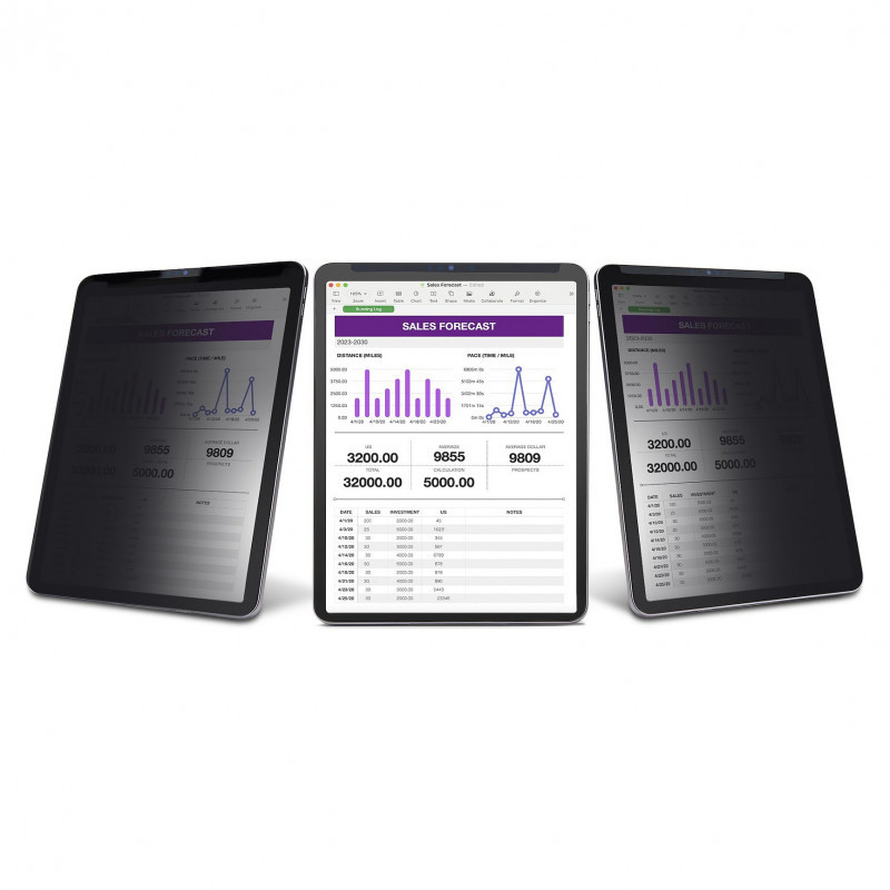 The security filter ensures optimal privacy in portrait or landscape orientations when viewed beyond 30° from the center, covering a total visible area of 60°. It supports touchscreen input and gestures, preserving the interactive experience of an iPad while maintaining the confidentiality of on-screen content.