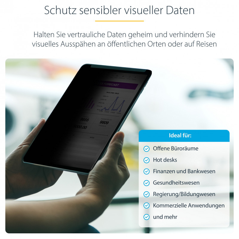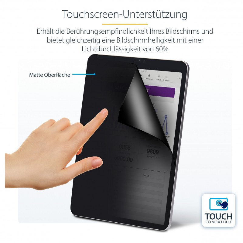 "StarTech.com 4-Way Privacy Screen For 11-inch iPad Pro, For Portrait/Landscape Orientations, Touch-Enabled, +/- 30 Deg. View, Blocks up to 51% Blue Light, Anti-Glare. Maximum screen size: 27.9 cm (11""), Suitable for: Tablet, Type: Frameless display privacy filter. Light transmission: 60%, Limits viewing angle: 30°. Weight: 43 g"\n"Prevent visual eavesdropping by limiting the viewing angle of an iPad screen