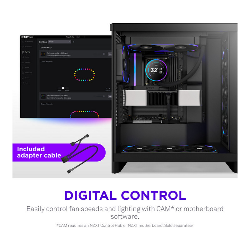 - Digital Control: Fine-tune fan speeds and RGB lighting effects through NZXT CAM* or motherboard software. *Requires NZXT Control Hub or NZXT motherboard required, sold separately.
