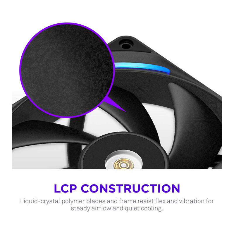 - LCP Construction: Liquid-crystal polymer blades and frame maintain their shape at high speeds, resisting flex and vibration for more powerful, consistent cooling.