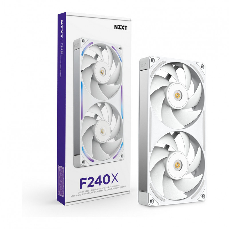 "NZXT F240X. Type: Fan, Fan diameter: 12 cm. Width: 240 mm, Depth: 30 mm, Height: 120 mm. Product colour: White"\n"The NZXT Performance Fans deliver powerful, quiet cooling with LCP construction, optimized blades, and a hybrid bearing system for superior airflow and durability. A reinforced core, advanced motor, and subtle RGB lighting combine performance and style for any gaming PC.