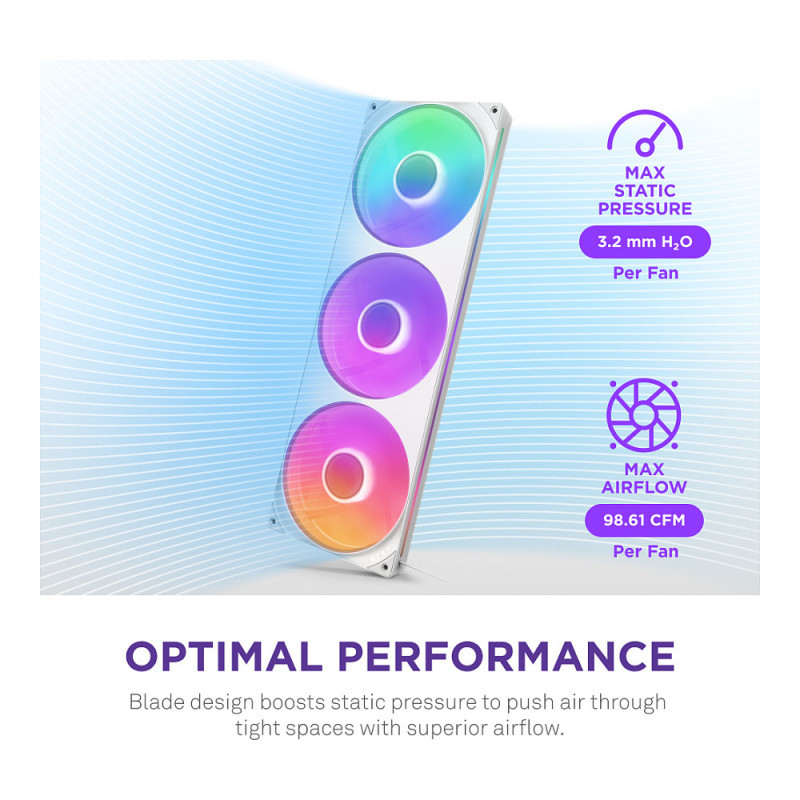 8 aRGB LEDs per fan hub shine through semi-translucent blades and frame side windows.