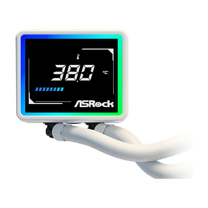 "Asrock Challenger White 360 Digital. Type: Liquid cooling kit, Fan diameter: 12 cm, Rotational speed (min): 1200 RPM, Maximum air pressure: 1.44 mmH2O, Bearing type: Rifle bearing. Product colour: White"\n"The Challenger AIO liquid cooler embodies fearless gaming in cooling design.