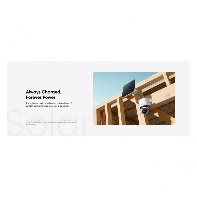 "Eufy 4G LTE Cam S330. Type: IP security camera, Placement supported: Outdoor, Connectivity technology: Wireless. Mounting type: Ceiling/Wall/Pole, Product colour: Black, White, Form factor: Bullet. Field of view (FOV) angle: 360°, Tilt angle range: 0 - 70°, Pan range: 0 - 344°. Digital zoom: 8x. Night vision distance: 8 m"\n"- Forever Power : Empower your viewing to go anywhere you desire. Enjoy 24/7 off-the-grid freedom with the upgraded solar panel and a powerful 9,400 mAh battery.