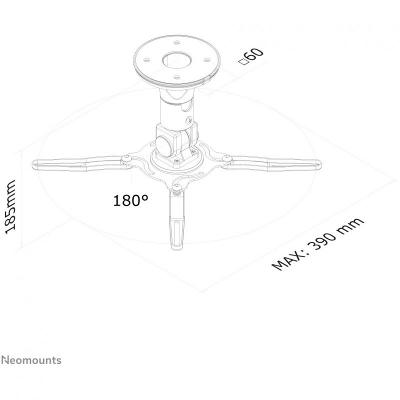 "Neomounts BEAMER-C50 Beamer ceiling mount - h 18,5 cm - full motion. Mounting type: Ceiling, Maximum weight capacity: 10 kg, Product colour: Black. Height: 185 mm, Weight: 1.16 kg, Package width: 180 mm. Country of origin: Taiwan. Products per master (outer) case: 12 pc(s), Master (outer) case net weight: 16 kg, Products per pallet (EU): 432 pc(s)"\n"The Neomounts projector ceiling mount, model BEAMER-C50 is a universal tilt-, swivel and/or rotatable ceiling mount for projectors up to 10 kilograms. This mount is a great choice for an optimal viewing experience. This versatile, ready to install mount, offers the convenience of installation to the ceiling without the need of additional accessories.