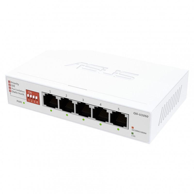 "ASUS QG-U1050. Switch type: Unmanaged. Basic switching RJ-45 Ethernet ports type: 2.5G Ethernet (100/1000/2500), Basic switching RJ-45 Ethernet ports quantity: 5. MAC address table: 16000 entries. Networking standards: IEEE 802.3ab, IEEE 802.3az, IEEE 802.3bz, IEEE 802.3u, IEEE 802.3x. DC input voltage: 12 V"\n"Upgrade to the 2.5G Ultra-Fast Network