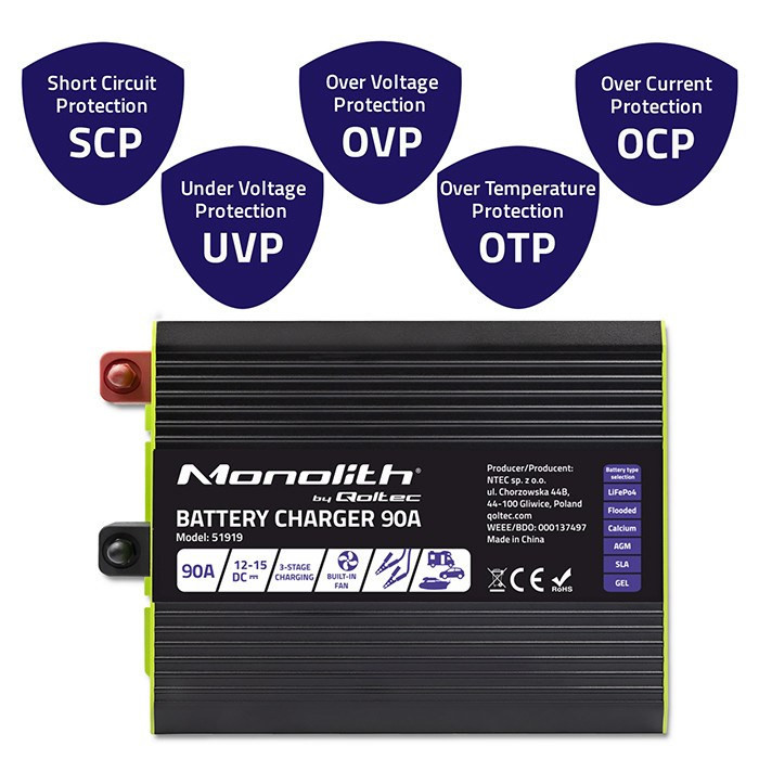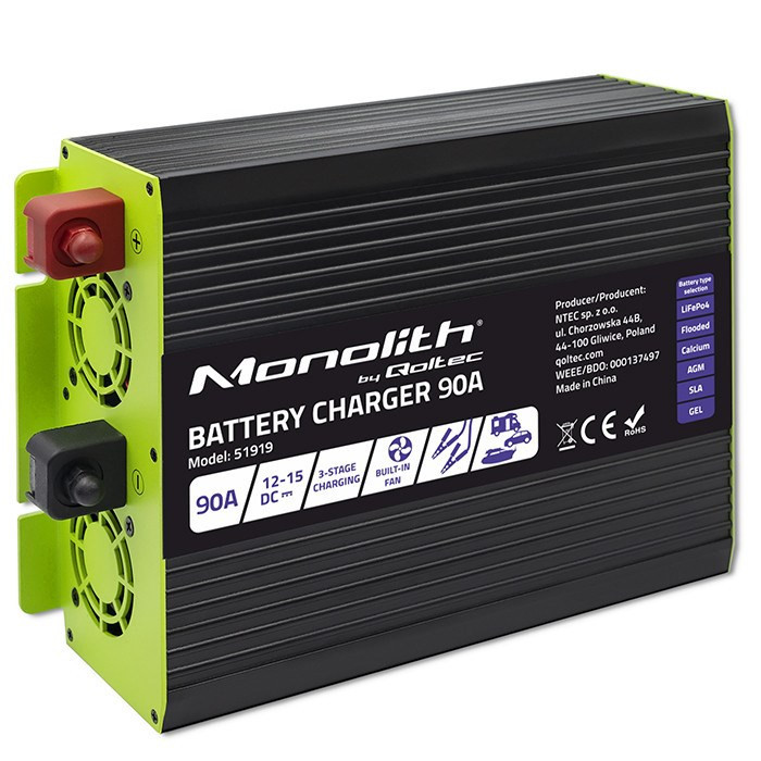 Qoltec 51919 Išmanusis „Monolith“ įkroviklis LiFePO4 AGM GEL SLA akumuliatoriams | 90A | 12V | Greitas įkrovimas
