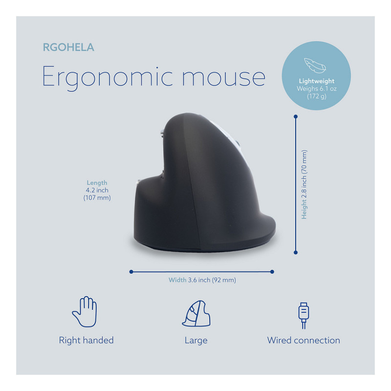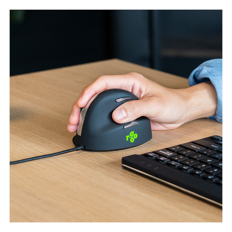 "R-Go Tools Ergonomic mouse R-Go HE Break with break software, large (hand size ≥ 185 mm), right-handed, Wired, black. Form factor: Right-hand. Movement detection technology: Optical, Device interface: USB Type-A, Movement resolution: 2400 DPI, Buttons type: Pressed buttons, Buttons quantity: 5, Scroll type: Wheel. Power source: Cable. Product colour: Black"\n"The R-Go HE Break Mouse is an ergonomic vertical mouse with integrated break software. This smart mouse helps you remember when it’s time for a break. The ergonomic R-Go HE Break mouse has a vertical position, so you will automatically move the mouse with your forearm instead of just your hand. This prevents strain injuries, such as CANS. The HE Break mouse has a round shape, so your hand and wrist are in a natural, relaxed position. The mouse fits comfortably in your hand and supports all fingers. Are you left- or right-handed? We have different versions and sizes available, so the mouse fits every hand. The LED colour signals in the mouse indicate how healthy you are working and when it is time for a break. The mouse encourages you to take breaks on a frequent basis. These vital breaks help prevent physical complaints, stimulate blood circulation in the body and keep you fit during your working day. During mouse usage, the light changes colour, like a traffic light. Green means ‘good job’, orange that it is time for a break, red that you have been working too long. By using these subtle colour signals, you receive feedback on healthy (break) behaviour in a simple and positive way. This product works together with the R-Go Break Software that won the Benelux Office Products Award 2021."