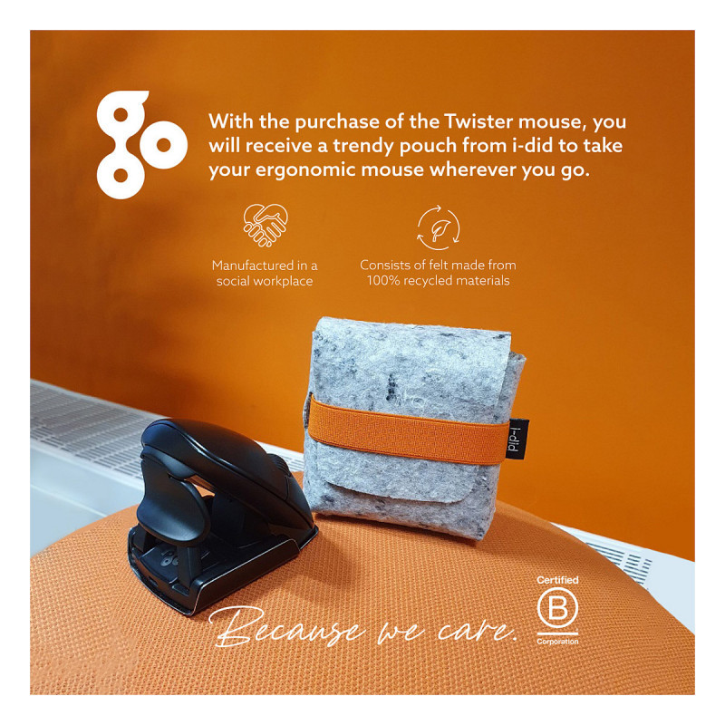 "R-Go Tools Ergonomic mouse R-Go Twister, with break software, ambidextrous mouse for both hands, foldable, bluetooth and wired. Form factor: Ambidextrous, Vertical design. Movement detection technology: Optical, Device interface: Bluetooth + USB Type-A, Movement resolution: 2400 DPI, Buttons type: Pressed buttons, Buttons quantity: 3, Scroll type: Wheel. Power source: Batteries/Cable. Product colour: Black"\n"This vertical mouse is ambidextrous, so it is suitable for both left- and right-handed people. Thanks to the patented switch & fold system, the Twister can be changed from a left-handed to a right-handed mouse and vice versa with one move. By regularly alternating between your left and right hand, you distribute the load on both hands and prevent annoying complaints such as RSI. In addition, the mouse is foldable, so it is easy to take with you. So you can work ergonomically anywhere. The Twister mouse also helps you remember when it is time for a short break. The LED indicator is controlled by our Break software and indicates just how healthy you are working, based on actual mouse use. This mouse can be used either Bluetooth or wired. The total battery time of the mouse after fully charging is up to 2 weeks (with average use)."