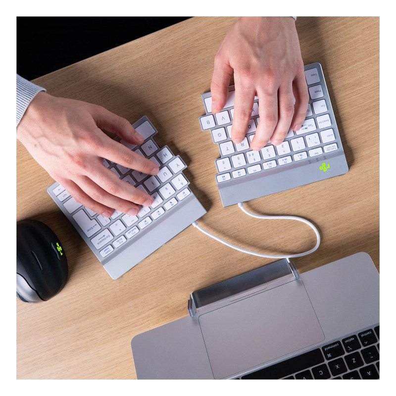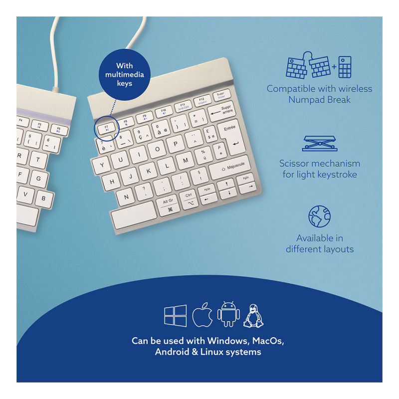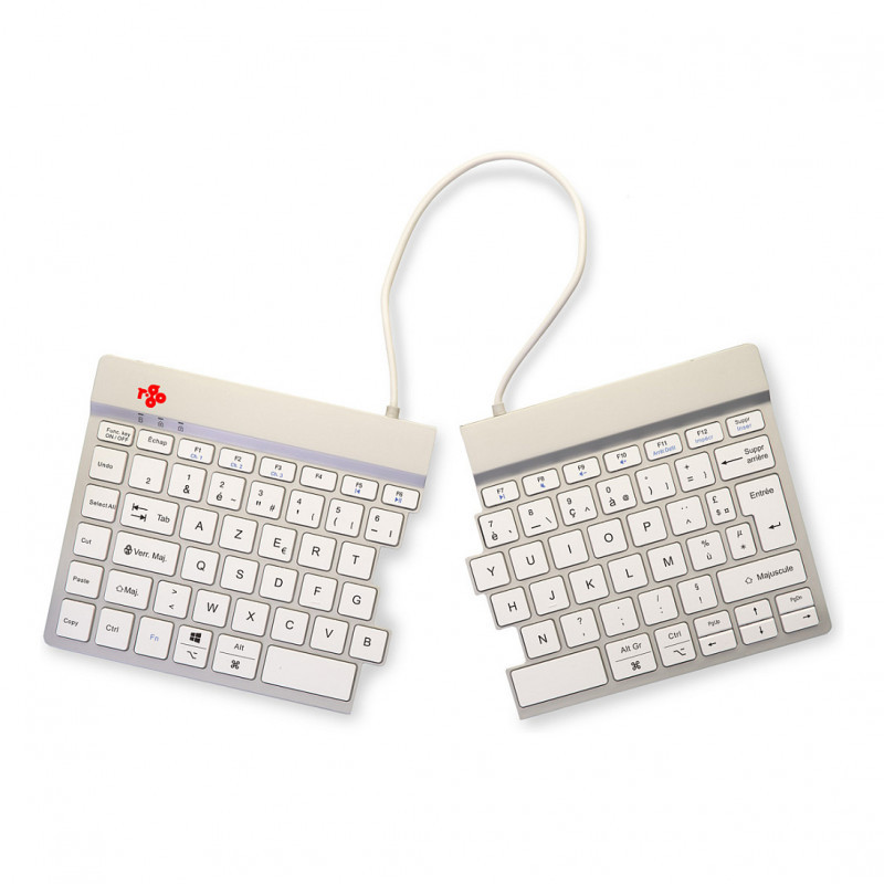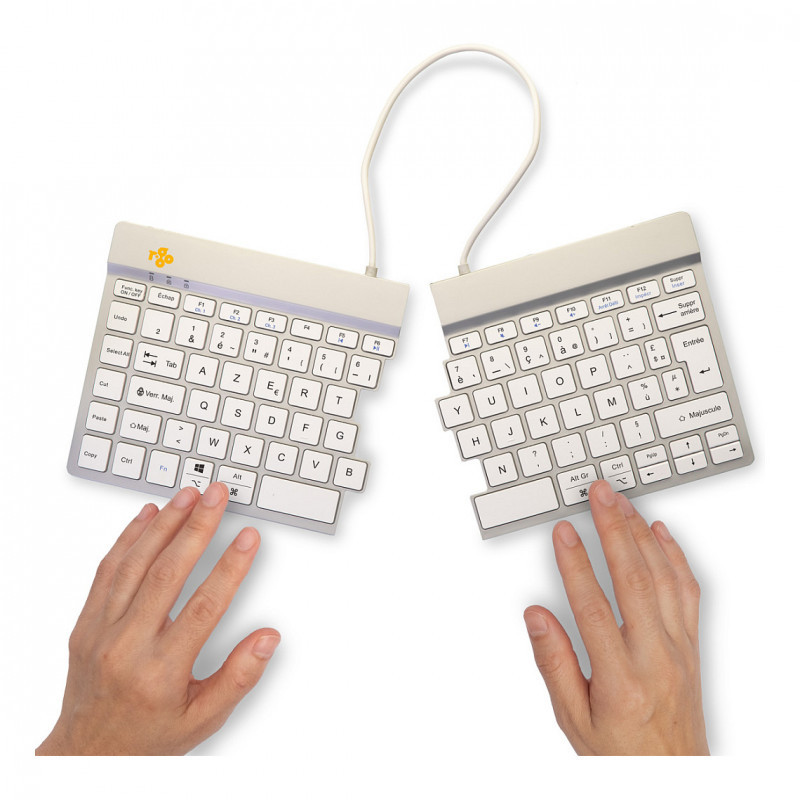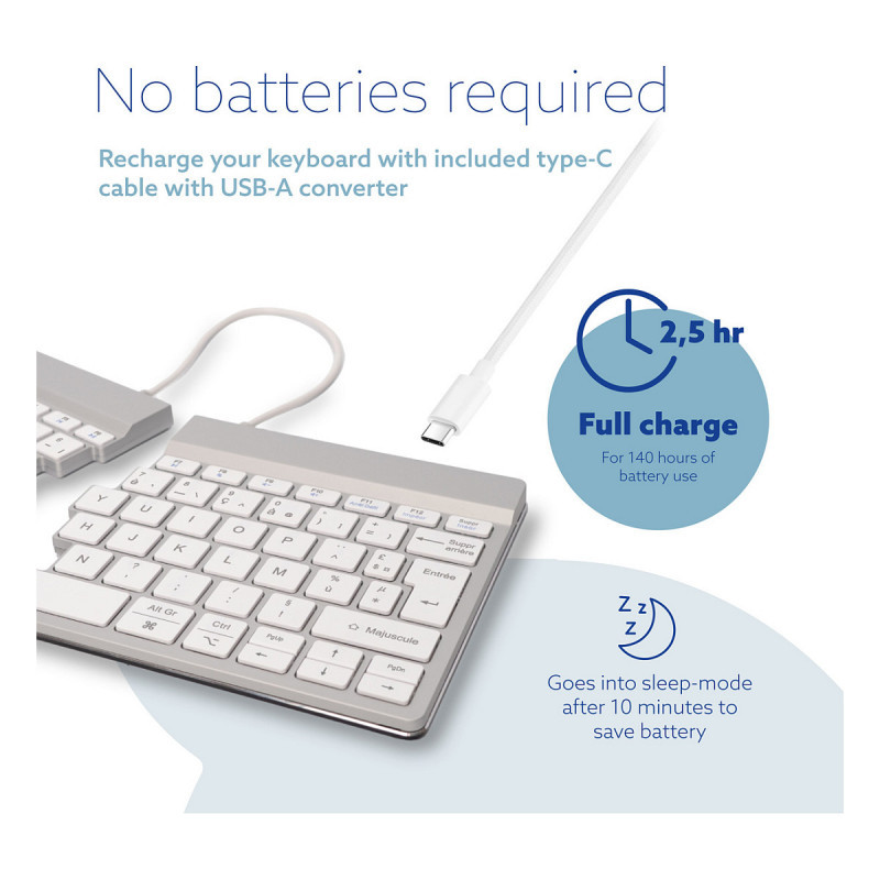 "R-Go Tools Ergonomic keyboard R-Go Split Break with break software, ergonomic split keyboard, AZERTY (FR), Bluetooth, white. Keyboard form factor: Mini. Keyboard style: Straight. Connectivity technology: Wireless, Device interface: Bluetooth, Keyboard key switch: Scissor key switch, Keyboard layout: AZERTY. Cable length: 1.02 m. Recommended usage: Office. Product colour: White"\n"The R-Go Split Break keyboard is an ergonomic split keyboard with integrated break software. This keyboard encourages you to take regular breaks. This keeps your body's blood flowing, prevents strain and keeps you fit during your working day. The keyboard consists of two separate parts, which you can place in any arrangement you like. This splitting prevents a kink in the wrists while typing. Typing with straight wrists reduces muscle tension and prevents pinching of tendons and blood vessels. The built-in magnet allows you to turn the two separate parts of the keyboard into a compact keyboard with one move. The compact size ensures that the mouse is always within reach. The light keystroke means minimal muscle tension is present while typing. The keyboard is flat, keeping your hands and wrists flat and relaxed while typing. LED colour signals in the keyboard indicate how healthy you are working and when it is time for a break. As you type, the light changes colour, like a traffic light. Green means ‘good job’, orange that it is time for a break, red that you have been working too long. Through these subtle colour signals, you receive feedback on your pause behaviour in a simple and positive way. This product works with the R-Go Break Software that won the Benelux Office Product Award 2021."