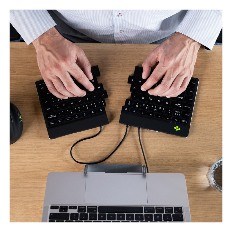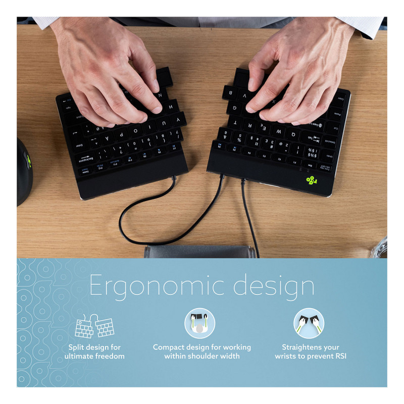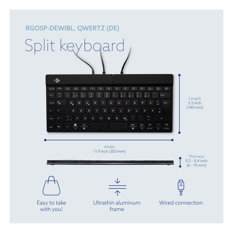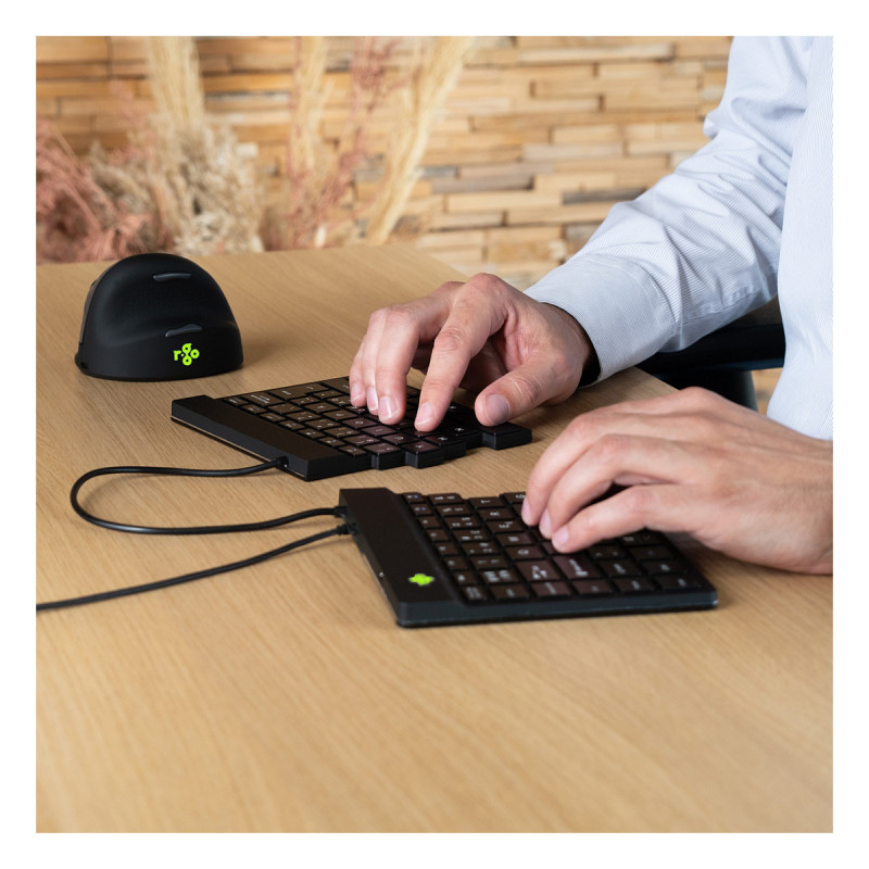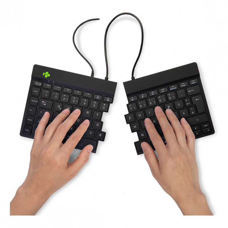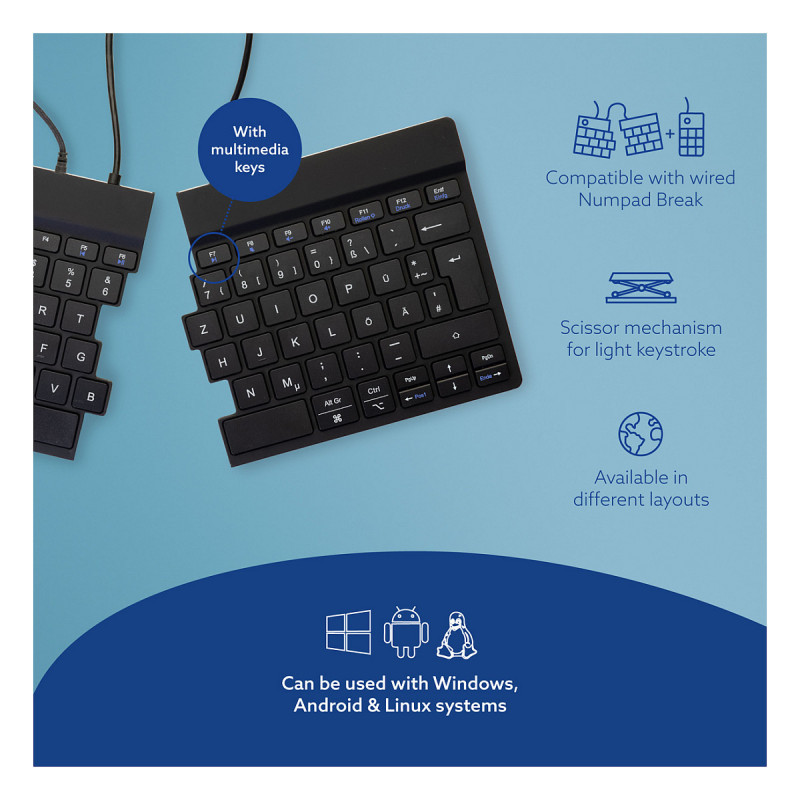 "R-Go Tools Ergonomic keyboard R-Go Split Break v2 with break software, ergonomic split keyboard, QWERTZ (DE), Wired, black. Keyboard form factor: Mini. Keyboard style: Straight. Connectivity technology: Wired, Device interface: USB, Keyboard key switch: Scissor key switch, Keyboard layout: QWERTZ. Cable length: 1.5 m. Recommended usage: Universal. Product colour: Black"\n"The R-Go Split Break keyboard is an ergonomically split keyboard with integrated break software. This keyboard encourages you to take regular breaks. This keeps your blood circulation flowing, prevents strain and keeps you fit during your working day.The keyboard consists of two separate parts that can be placed in any desired configuration. This split design prevents your wrists from bending while typing. Typing with straight wrists reduces muscle tension and prevents pinching of tendons and blood vessels. The built-in magnet allows you to convert the two separate parts of the keyboard into a compact keyboard with a single movement. The compact size ensures that the mouse is always within reach. The light keystrokes minimise muscle tension while typing. The keyboard is flat, keeping your hands and wrists flat and relaxed while typing.The LED colour signals in the keyboard indicate how healthy you are working and when it is time for a break. While typing, the light changes colour, like a traffic light. Green means “good going”, orange means it's time for a break, and red means you've been working too long. These subtle colour signals provide you with simple and positive feedback on your break behaviour. This product works in conjunction with the R-Go Break Software, which won the Benelux Office Product Award 2021."