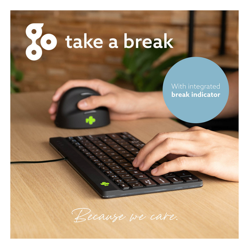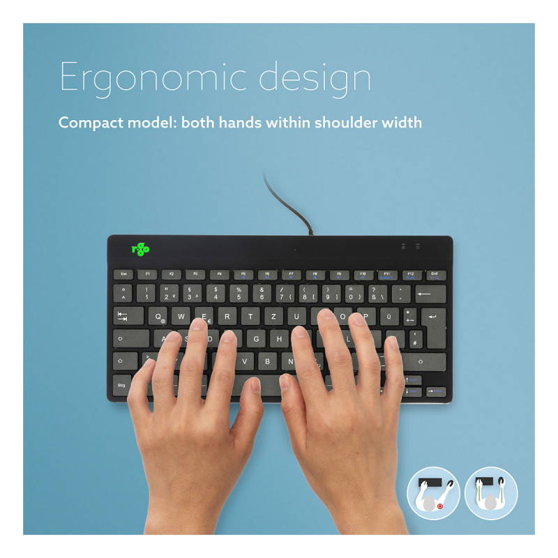 "R-Go Tools Ergonomic keyboard R-Go Compact Break, compact keyboard with break software, QWERTZ (DE), wired, black. Keyboard form factor: Mini. Keyboard style: Straight. Connectivity technology: Wired, Device interface: USB, Keyboard key switch: Scissor key switch, Keyboard layout: QWERTZ. Cable length: 1.6 m. Product colour: Black"\n"This compact keyboard has all the ergonomic features for healthy typing. The compact design ensures that your hands always remain within shoulder width when using keyboard and mouse simultaneously. The light keystroke reduces muscle tension while typing. The keyboard is ultra thin, so your hands and wrists are in a relaxed, natural position while typing. This ensures better blood flow to your hands. The R-Go Compact Break keyboard indicates with LED colour signals when it is time to take a break. As you type, the light changes colour, like a traffic light. When the light turns green, it means you are working healthily. Orange indicates it is time for a short break and red that you have been working too long. Taking short breaks during your working day will increase your concentration, prevent strain injuries and keep you fit during your working day. This product works together with the R-Go Break Software that won the Benelux Office Products Award 2021."