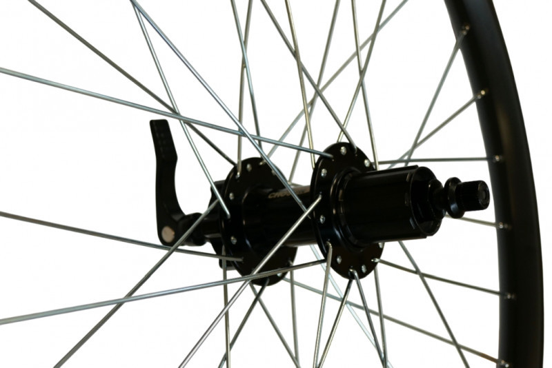 507 x 24, 10 x 135 mm QR, Chosen A4582B-TR stebulė, 4 uždari guoliai, 32H, 6-bolt D-brake, 8-11 pavarų, dvigubas ratlankis, juodas