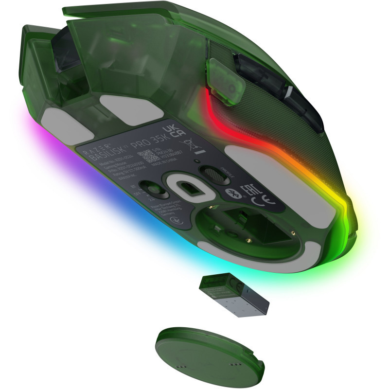 "Razer Basilisk V3 Pro 35K. Form factor: Right-hand. Movement detection technology: Optical, Device interface: RF Wireless + Bluetooth + USB Type-A, Movement resolution: 35000 DPI, Buttons type: Pressed buttons, Buttons quantity: 11, Scroll type: Wheel, Acceleration (max): 70 G. Illumination colour: Multi. Power source: Batteries/Cable. Product colour: Green"\n"RAZER BASILISK V3 PRO 35K