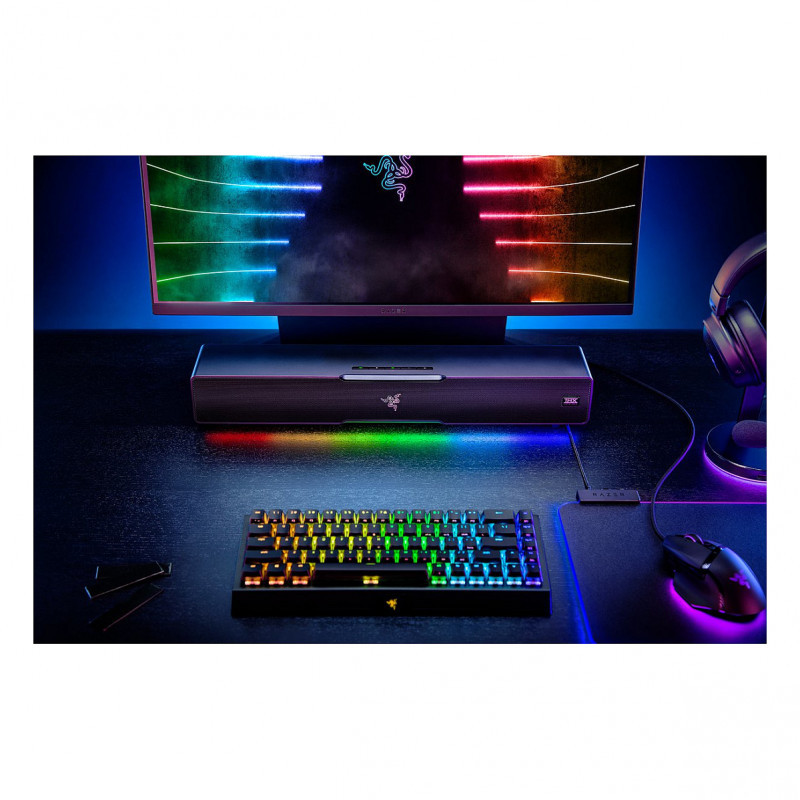 "Razer Leviathan V2. RMS rated power: 65 W. Soundbar speaker RMS power: 65 W, Tweeter diameter: 2 cm, Full-range driver diameter: 9.5 cm. Subwoofer frequency range: 45 - 20000 Hz. Product colour: Black, Country of origin: China. Connectivity technology: Wireless"\n"ILLUMINATE YOUR SOUND